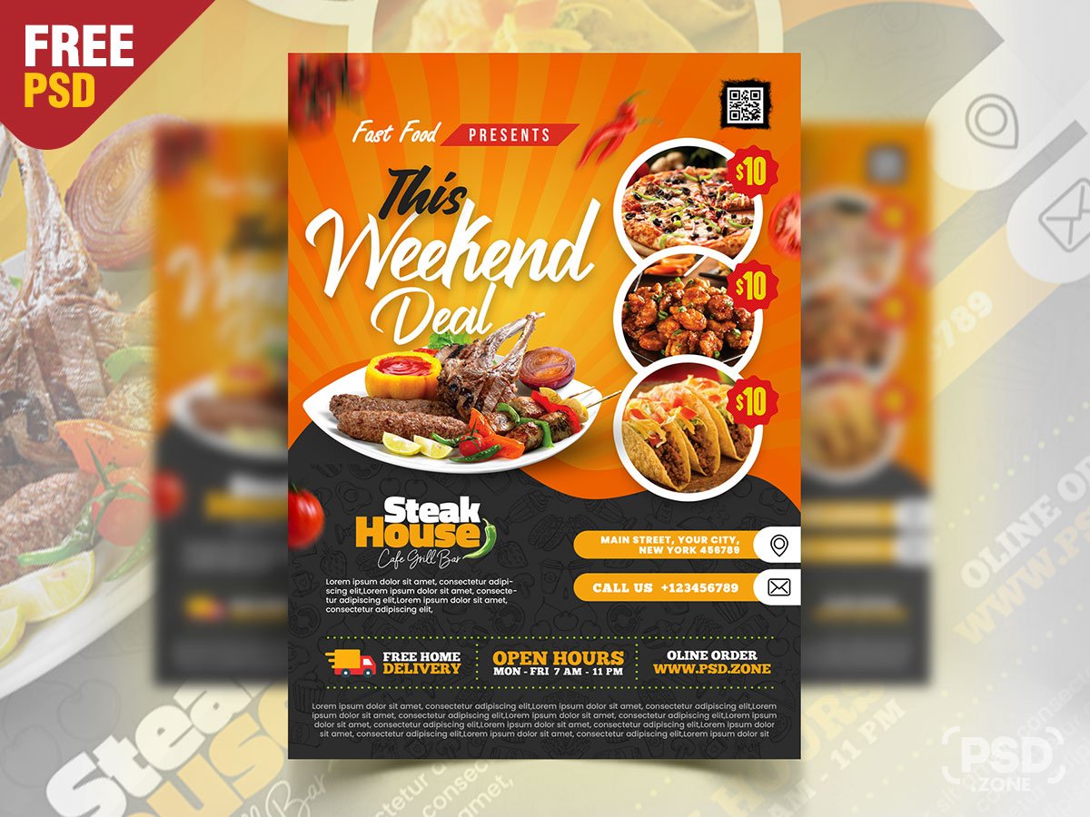 Find the creative flyer design for your Restaurant Business? So here is Free Food Menu and Restaurant Flyer PSD Template is perfect for any types of restaurant, cafe, fast food, steak house, Catering, Grill bar and many more. This Food Menu and Restaurant Flyer PSD Template is super simple to edit and customize with your own details using Adobe Photoshop. Simply add your food images and text. This template download contains a a4 size, 300 dpi print-ready CMYK psd file.