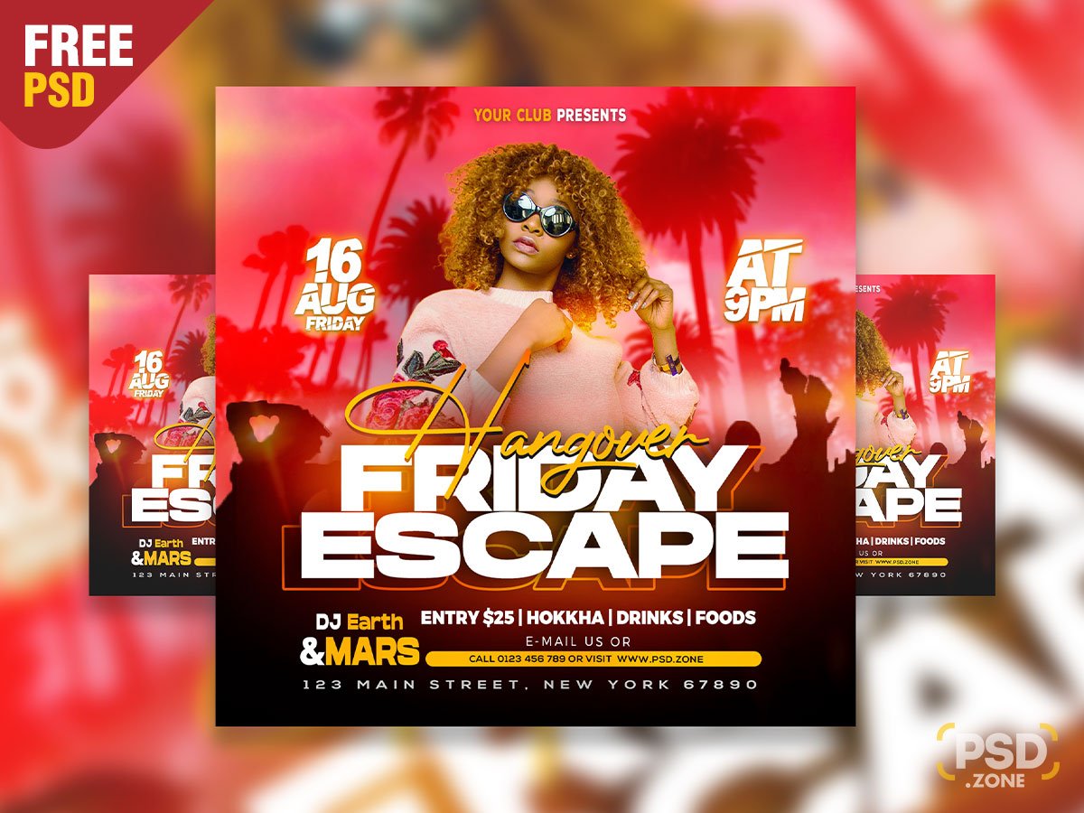 Check out our newest Freebie Hangover Friday DJ Party Social Post PSD. This Free Hangover Friday DJ Party Social Post PSD designed to promote any kind of in friday night party, rock music, music party, weekly event or other kind of special evenings.